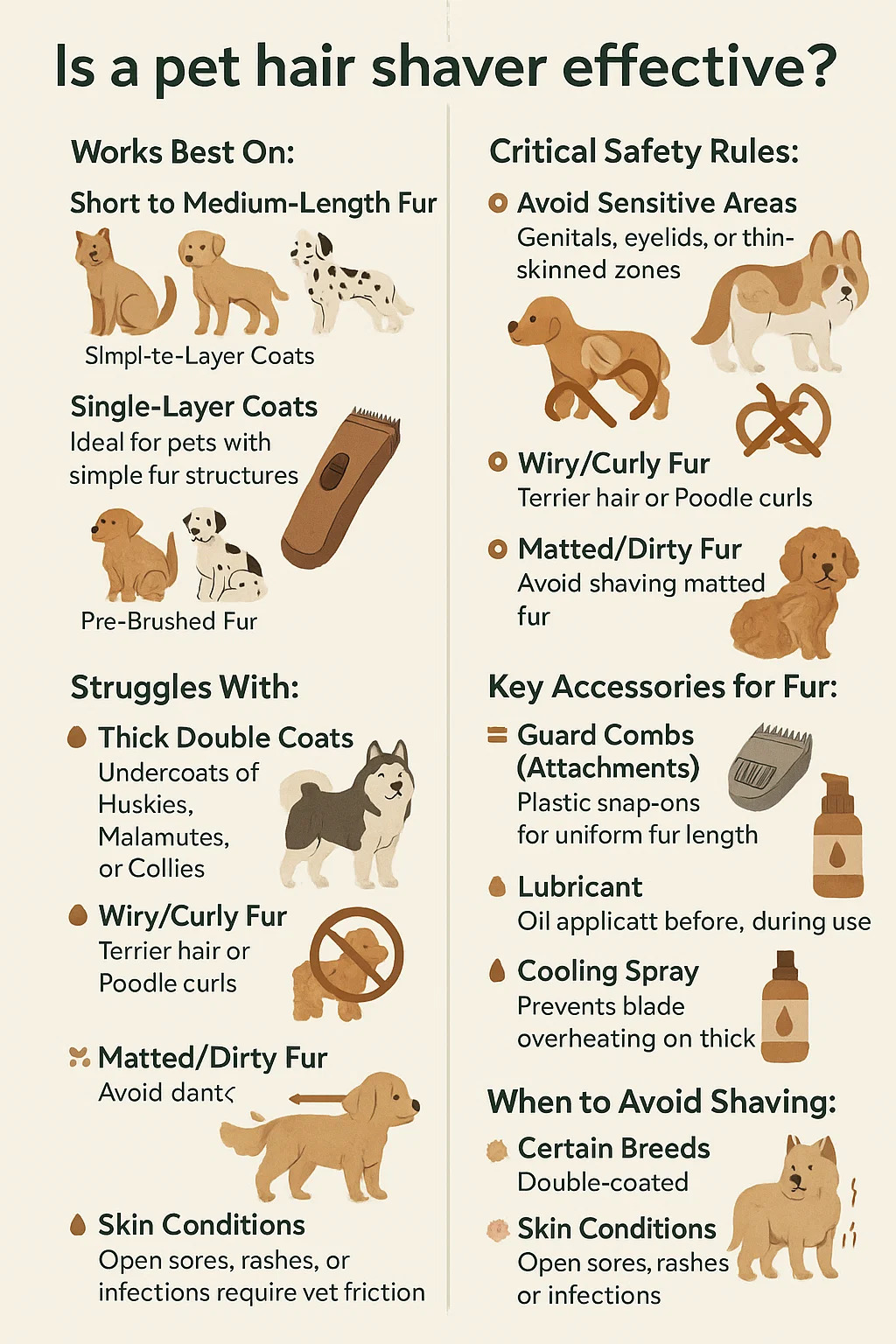 Ja, a Kjæledyrhårbarbermaskin (også kalt kjæledyrklippere eller trimmere) er spesielt designet for å jobbe med dyrepels, men effektiviteten avhenger av pelstype, verktøykvalitet og teknikk. Nedenfor er et detaljert sammenbrudd: