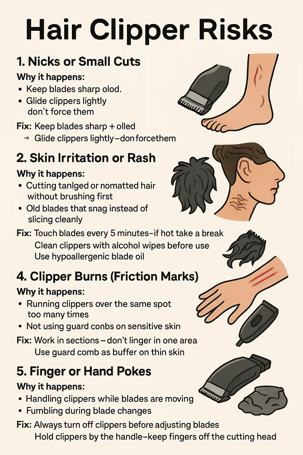 Ja, ved å bruke en hårklipper kan føre til mindre skader eller ubehag hvis den ikke håndteres forsiktig. Her er en enkel oversikt over vanlige risikoer og hvordan du unngår dem: