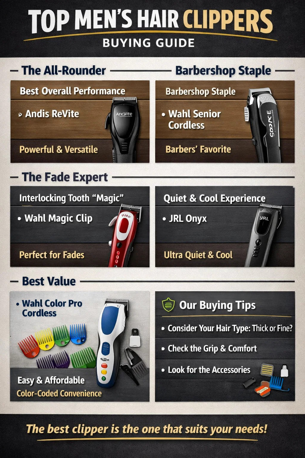 Beste generelle ytelse (f.eks. Andis ReVite): Dette er et toppnivåalternativ på markedet. Den kombinerer perfekt en kraftig motor av profesjonell kvalitet med bekvemmeligheten av hjemmebruk. Ikke bare er skjærehastigheten ekstremt høy, men bladene er også lett å fjerne for rengjøring, slik at selv nybegynnere kan oppleve en eksklusiv følelse.