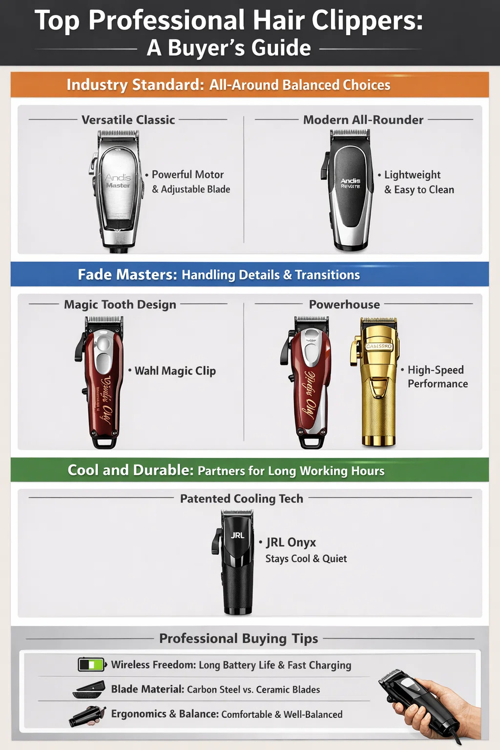 Moderne allrounder (f.eks. Andis ReVite): Dette er en veldig populær nykommer de siste årene. Den kombinerer den kraftige ytelsen til tradisjonelle maskiner med et moderne, lett design. Den er behagelig å holde i lengre perioder, og bladene er enkle å fjerne og rengjøre, noe som gjør den ideell for arbeidsmiljøer med høy intensitet.